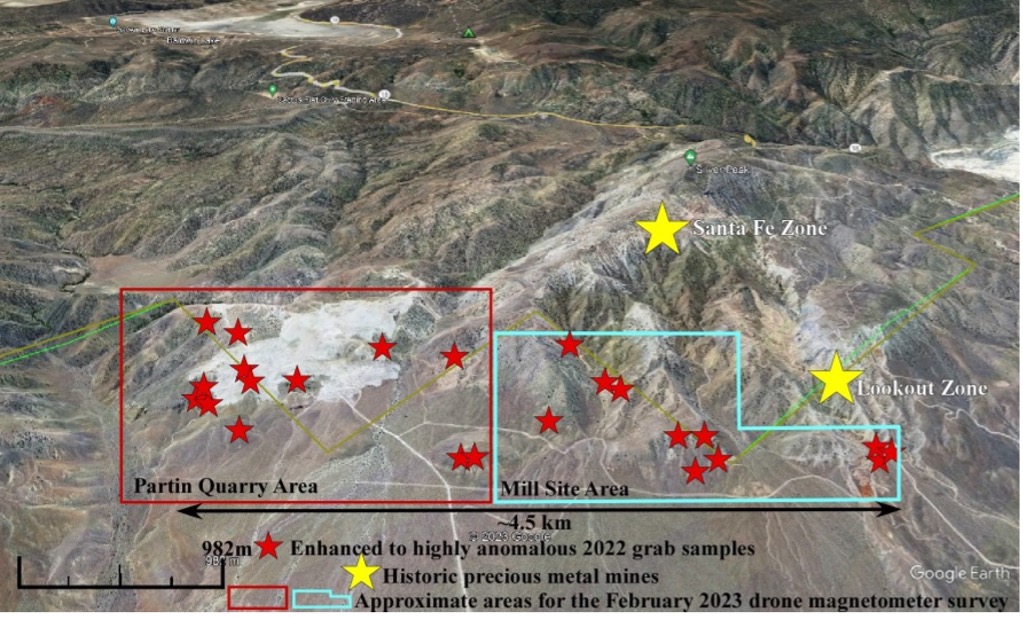 The lithostructural setting of mineralization along the Mill Site area is similar to that observed at the historic workings and reported within the Company’s National Instrument 43-101 report for the Blackhawk property filed on SEDAR on May 16, 2022. The Partin Quarry area findings provide unequivocal geological and geochemical evidence for both skarn mineralization and manto-style carbonate replacement (CRD). Both the skarn and CRD geological settings represent new geological models for exploration on the Blackhawk property. Utilizing this newly acquire geological and geochemical data, the Company has initiated a detailed drone magnetometer survey over the Partin Quarry and Mill Site areas in order to define prospective intrusion-carbonate contacts.